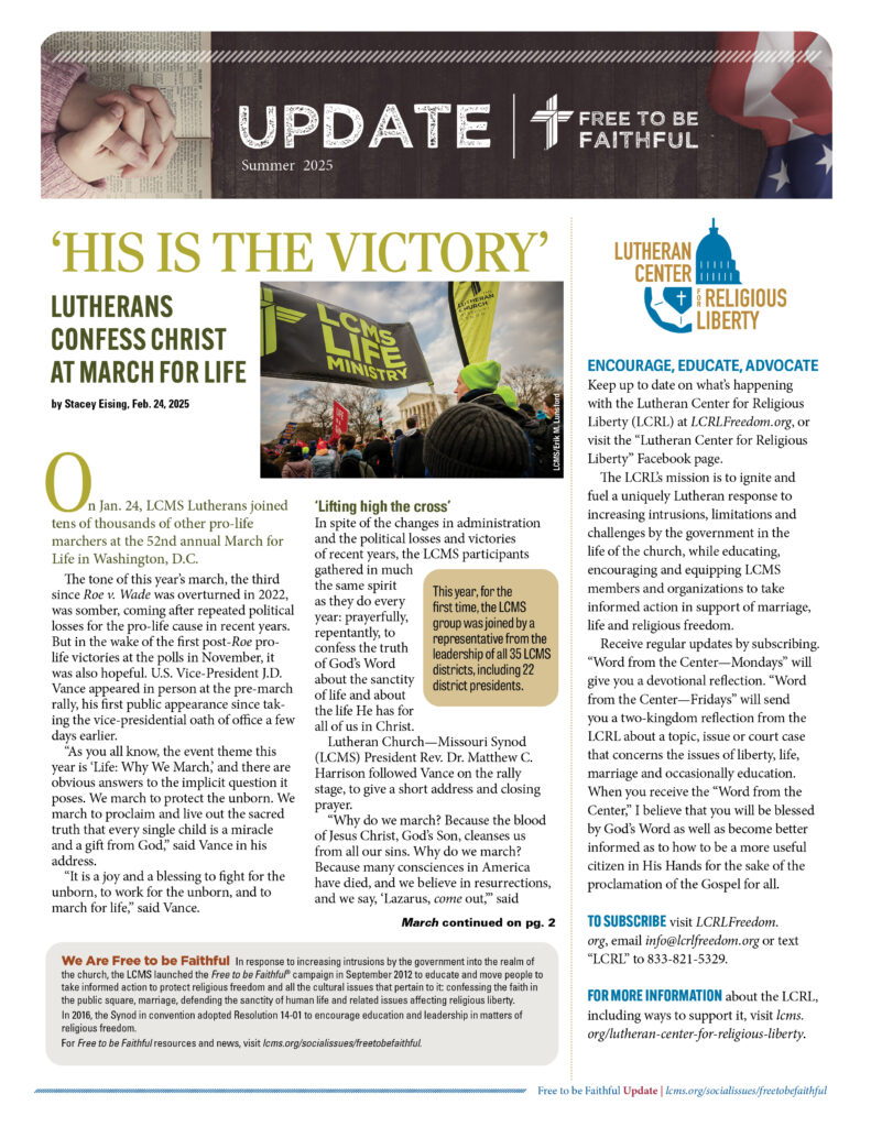 If you would like to stay informed on issues related to marriage, life, religious freedom or the Lutheran Center for Religious Liberty, please send your name and address to freetobefaithful@lcms.org.