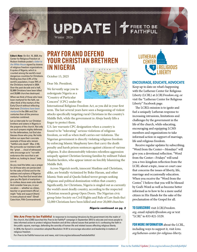 If you would like to stay informed on issues related to marriage, life, religious freedom or the Lutheran Center for Religious Liberty, please send your name and address to freetobefaithful@lcms.org.