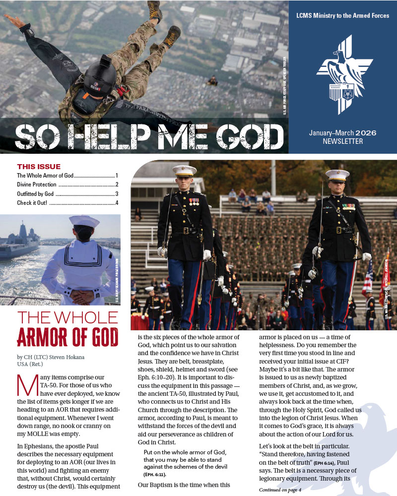 This quarter’s issue of So Help Me God, the newsletter of LCMS Ministry to the Armed Forces, brings both a historical and relatable take on the passage. Chaplain Steven Hokana focuses on two of the components of the whole armor of God — the belt of truth and the breastplate of righteousness — for us to consider in study.
